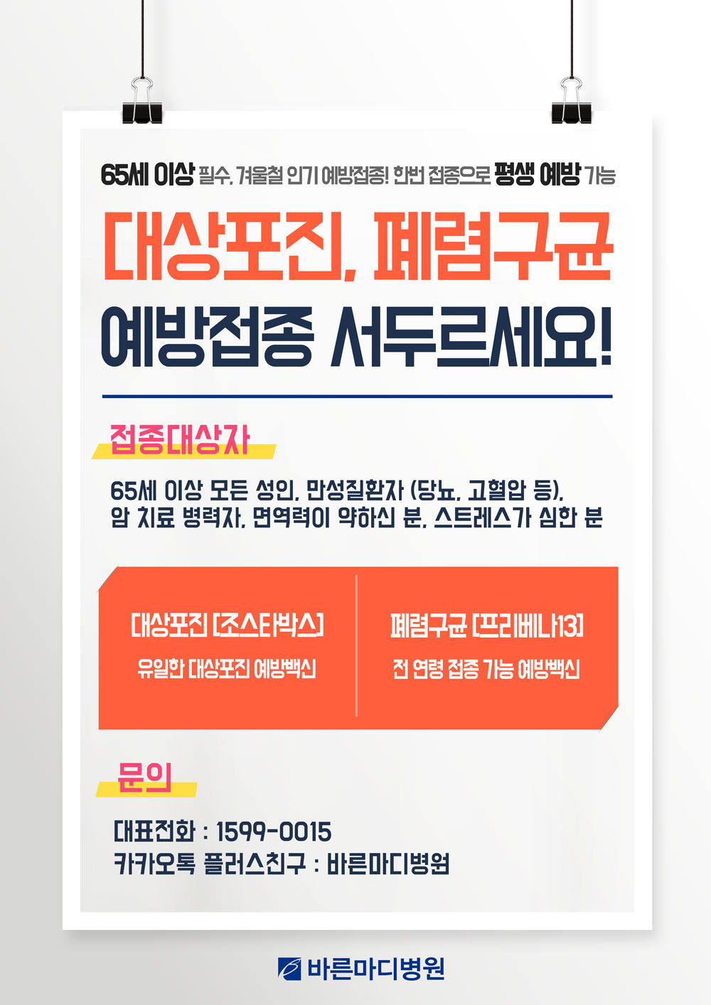 바른마디병원에서 대상포진과 폐렴구균 예방접종 하시고 겨울철 건강 든든히 챙기세요^^