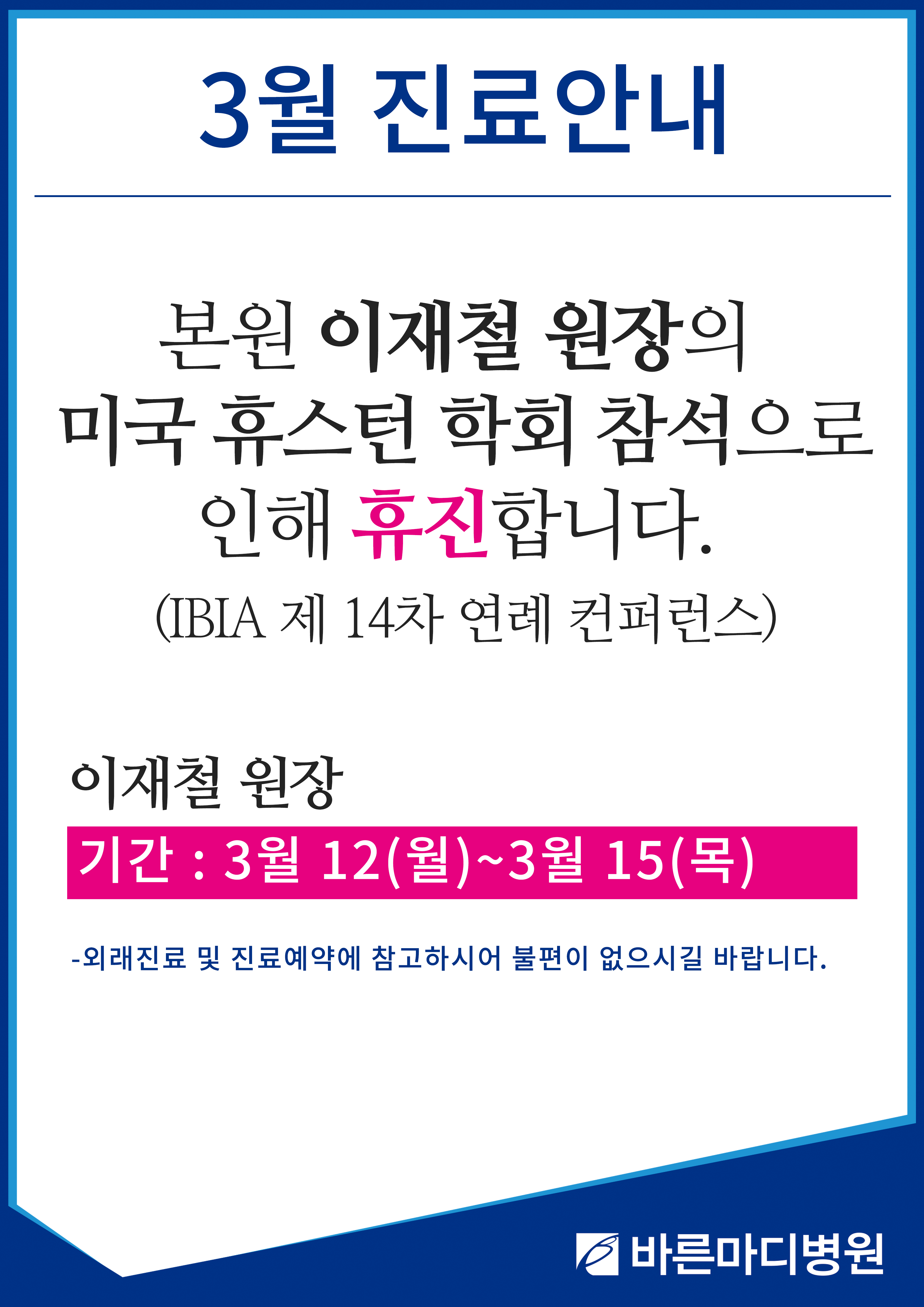 본원 이재철 원장의 미국 휴스턴 학회 참석으로 인해 휴진하게 되어 진료 일정을 공지 드립니다.