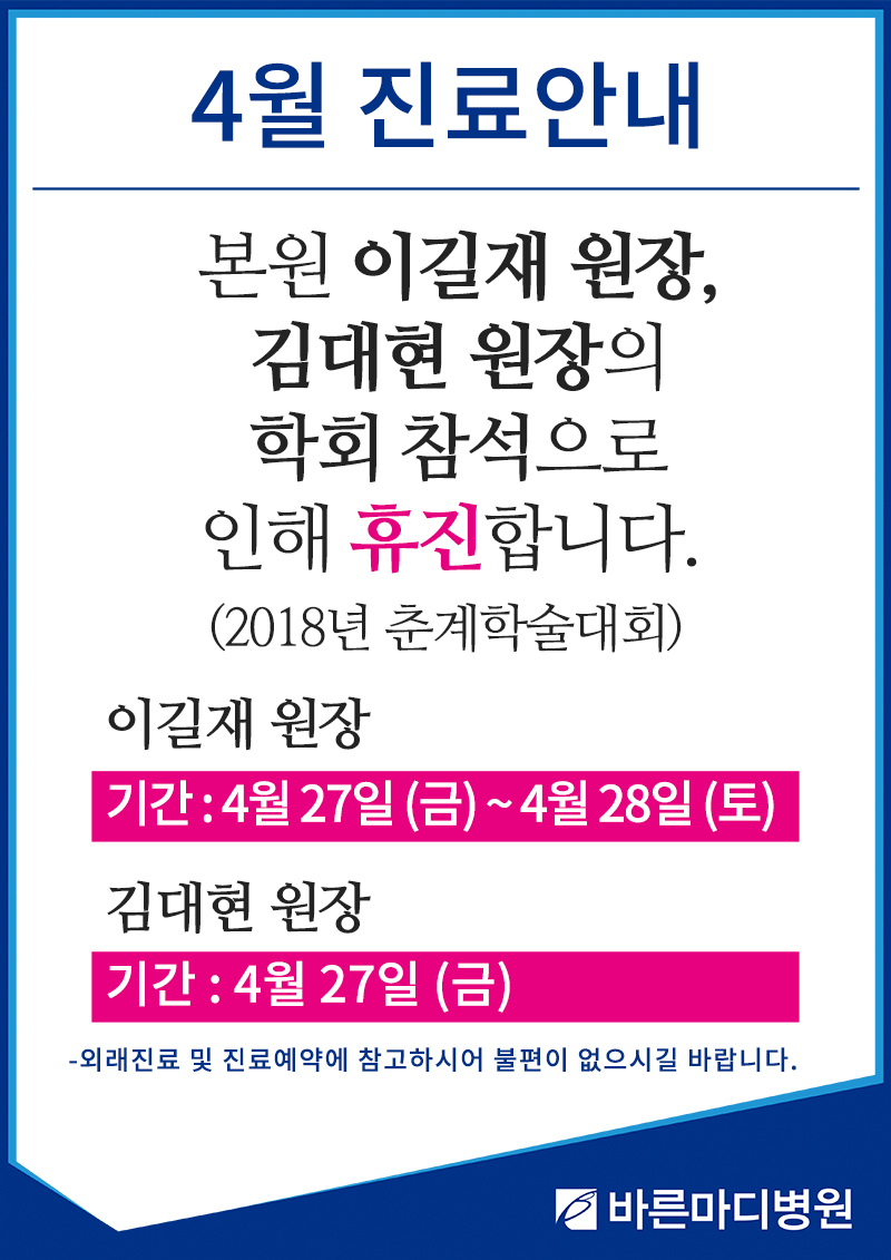 본원 이길재 원장, 김대현 원장의 춘계 학술대회 참석으로 인해 휴진하게 되어 진료 일정을 공지 드립니다.