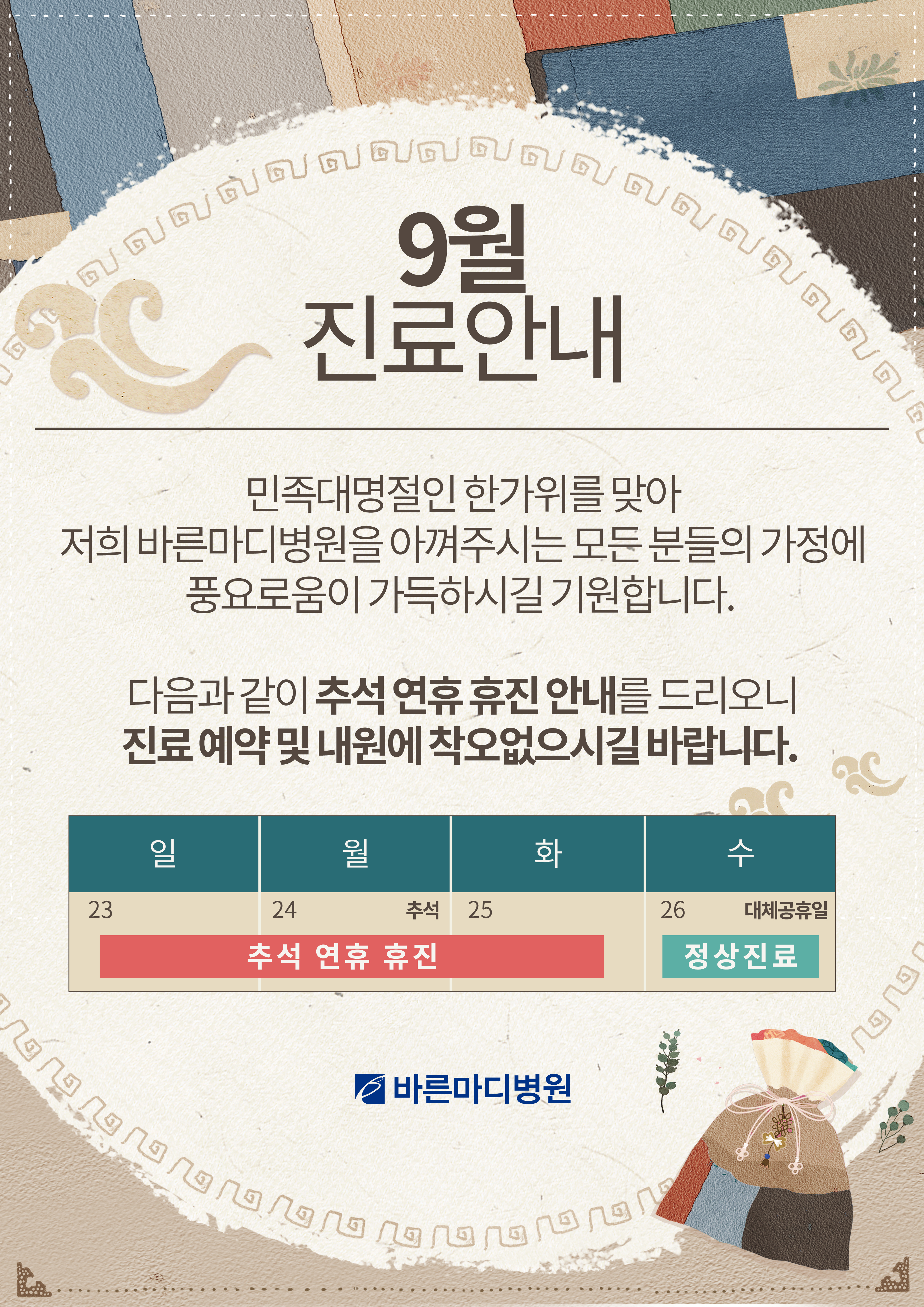 [바른마디병원 추석 연휴 휴진 안내]