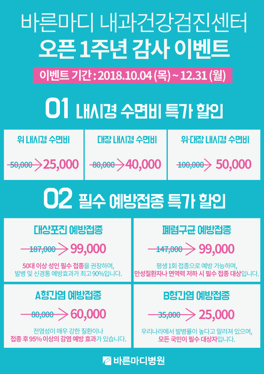 위·대장내시경 수면비 할인과 그밖에 필수예방접종들을 한데 모았습니다.