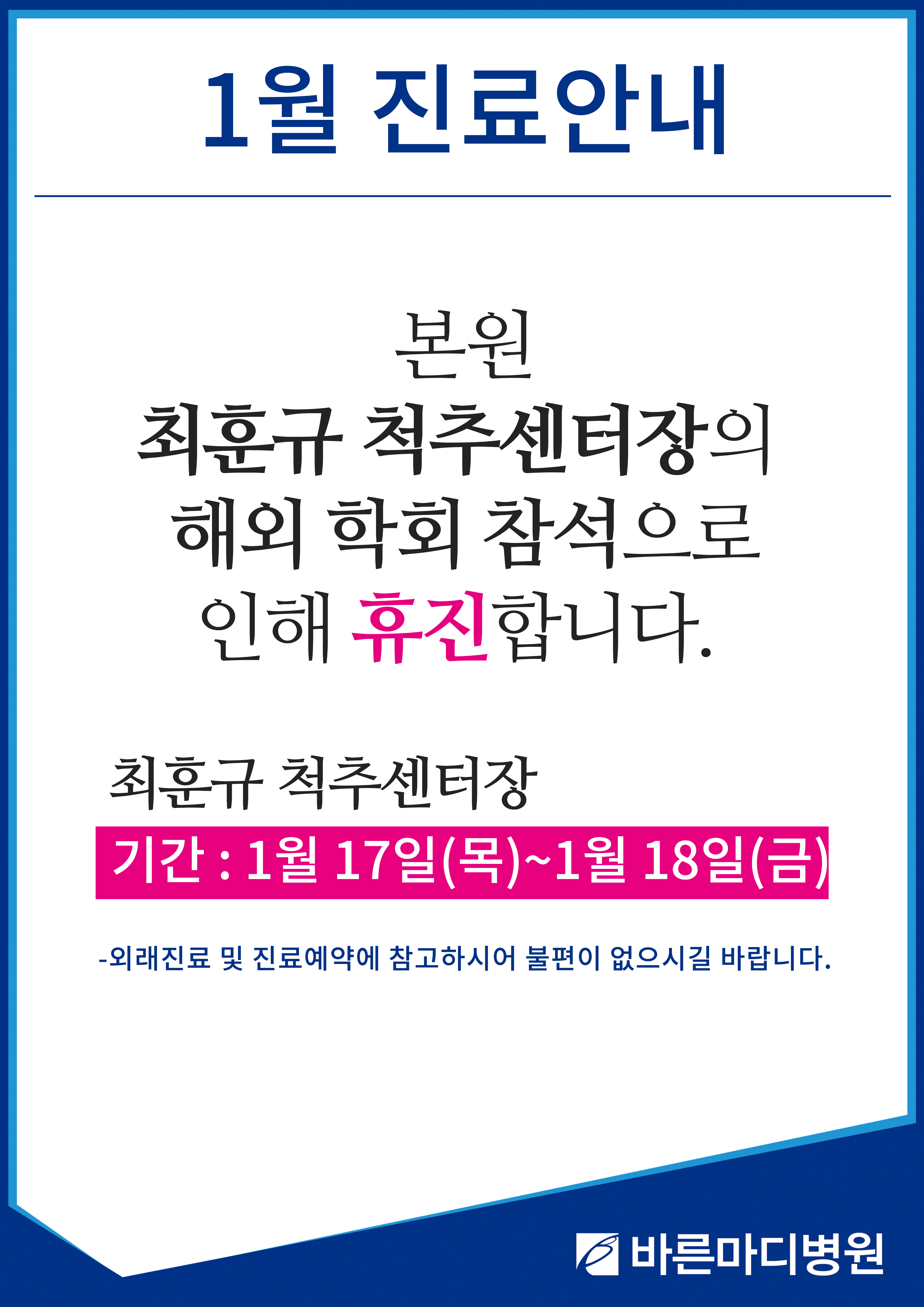 본원 최훈규 척추센터장의 학회 참석으로 인해 휴진하게 되어 진료 일정을 공지 드립니다.