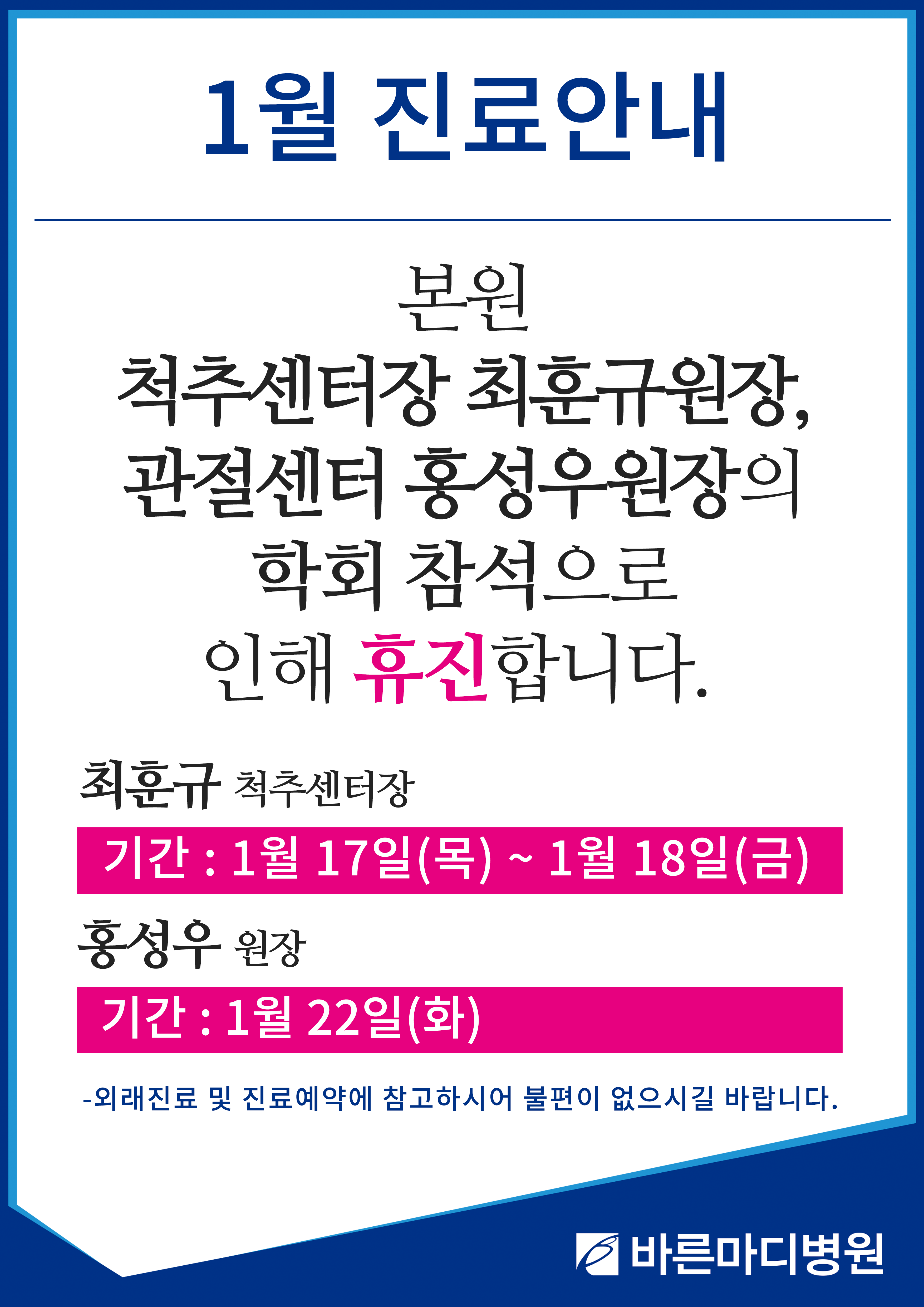 본원 최훈규 척추센터장과 홍성우 원장의 학회 참석으로 인해 휴진하게 되어 진료 일정을 공지 드립니다.