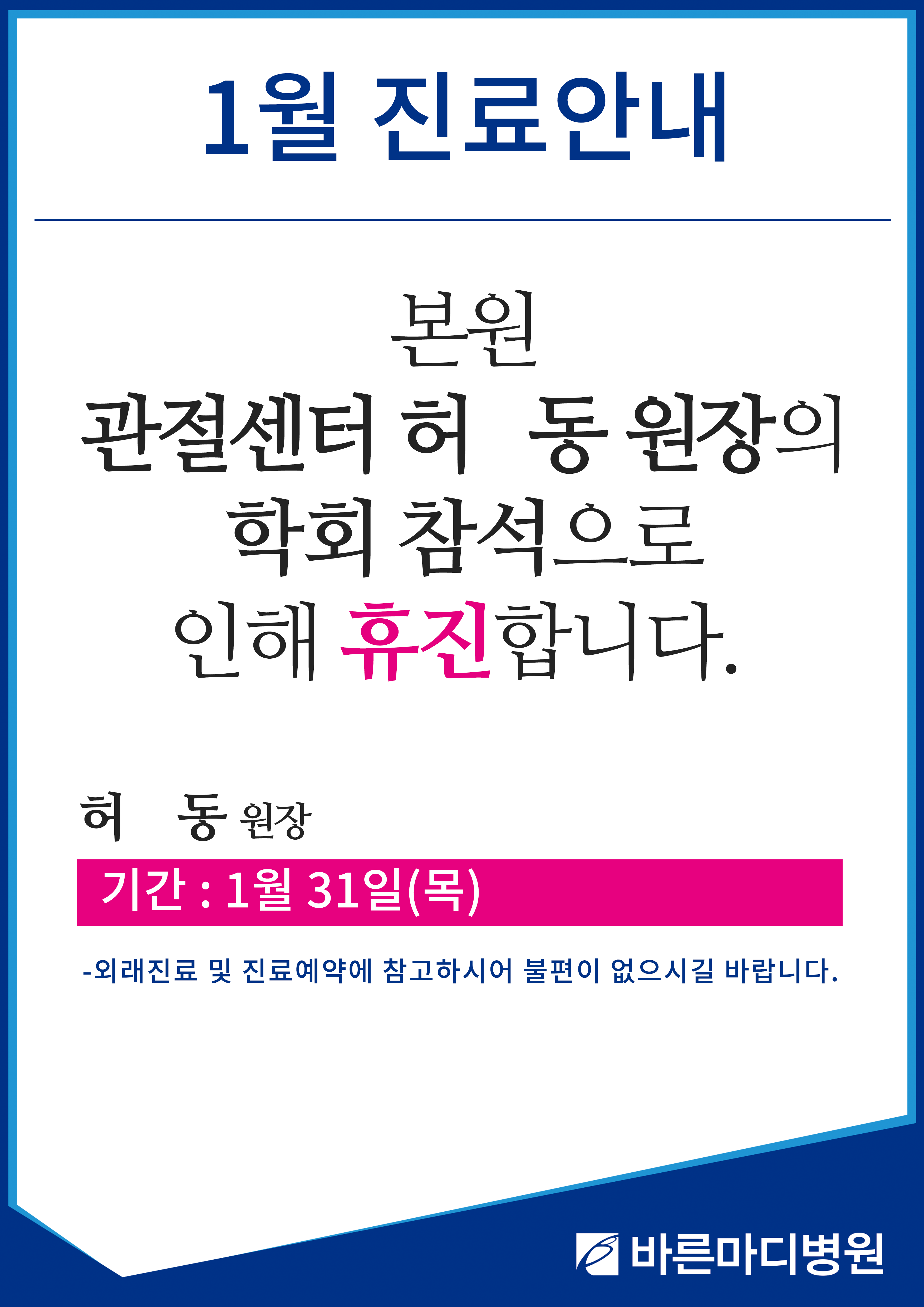 본원 허동 원장의 학회 참석으로 인해 휴진하게 되어 진료 일정을 공지 드립니다.