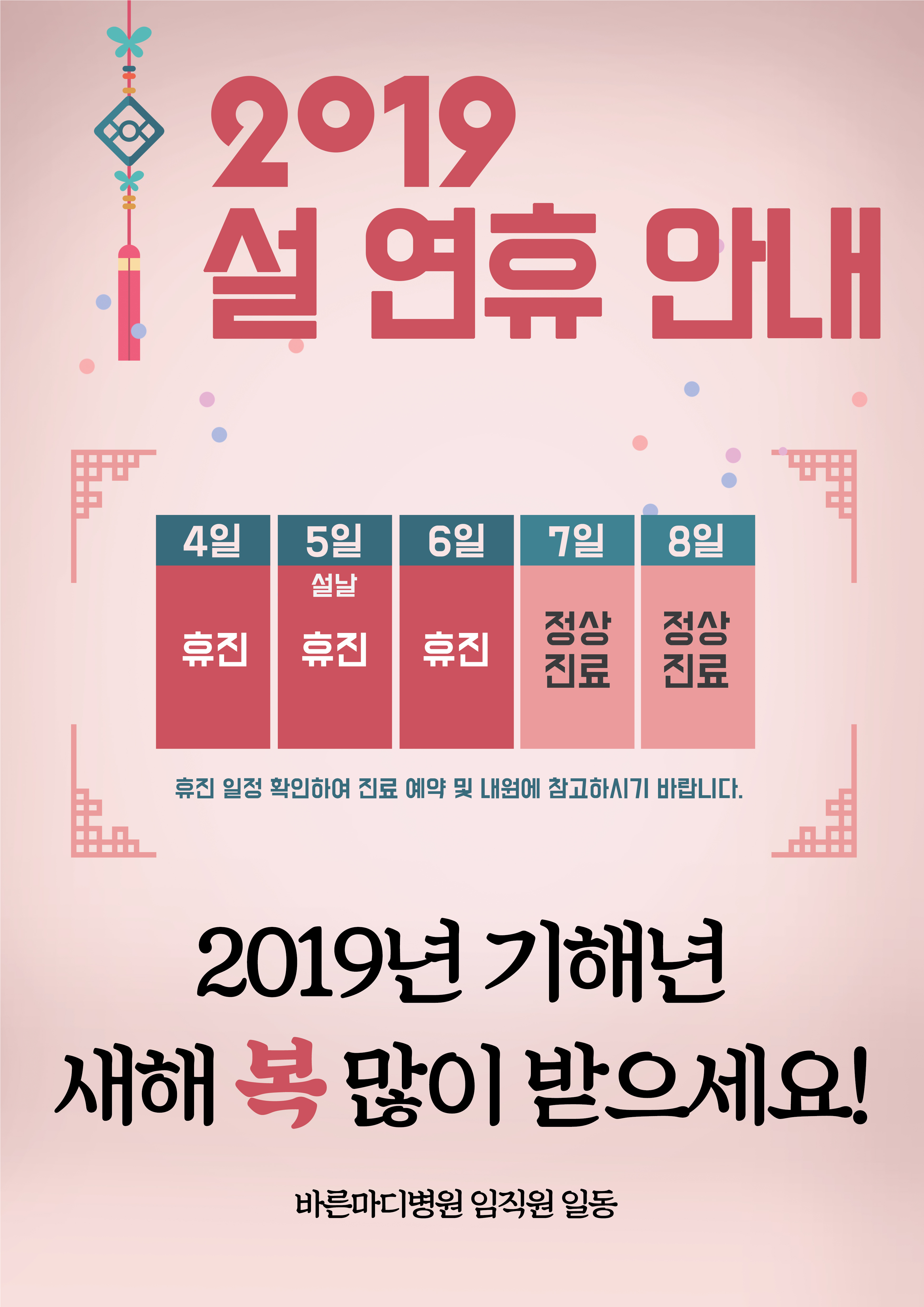 설날 연휴 시작일인 2월 4일 (월요일)부터 2월 6일 (수요일)까지 휴진합니다.