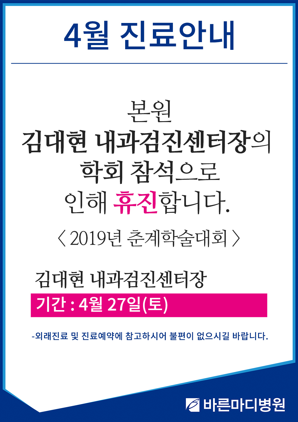 본원 김대현 내과건강검진센터장의 학회 참석으로 인해 휴진하게 되어 진료 일정을 공지 드립니다.