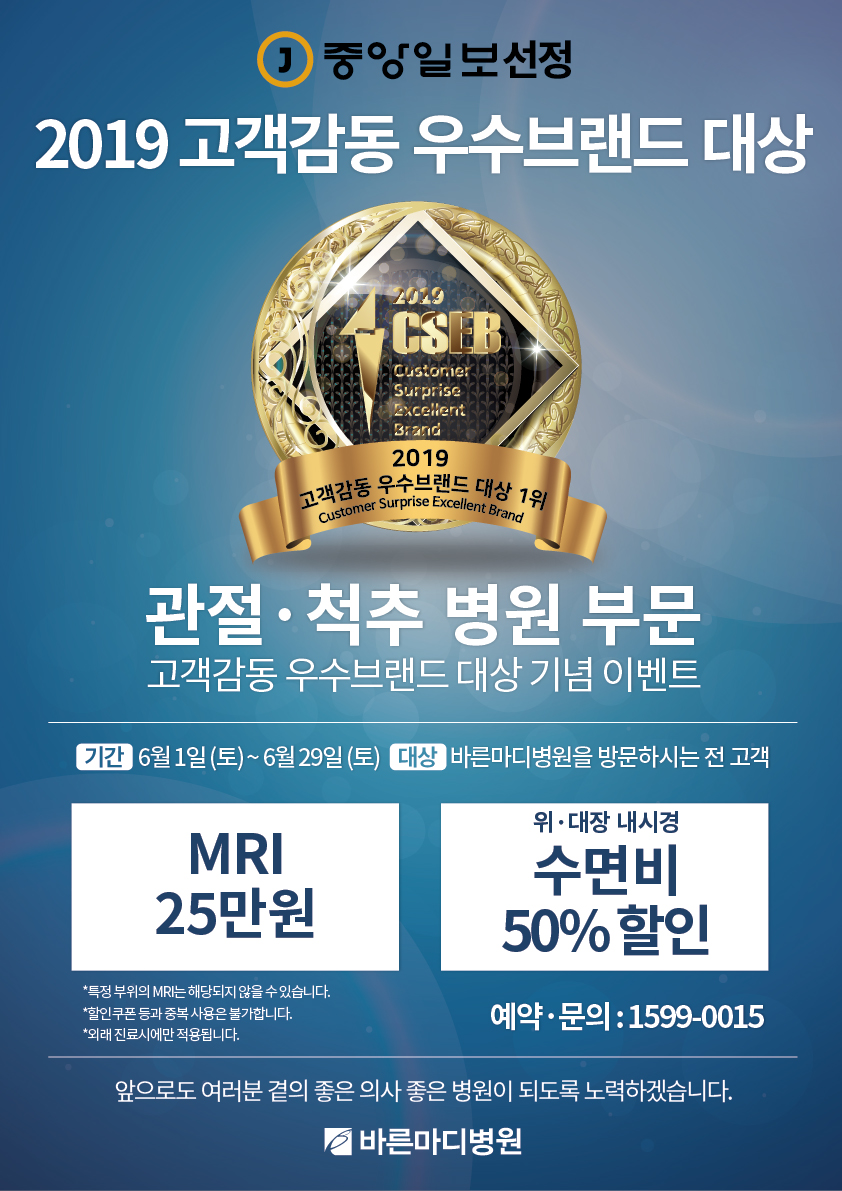 2019 고객감동우수브랜드대상 관절척추병원 부문 1위 수상을 하였습니다.