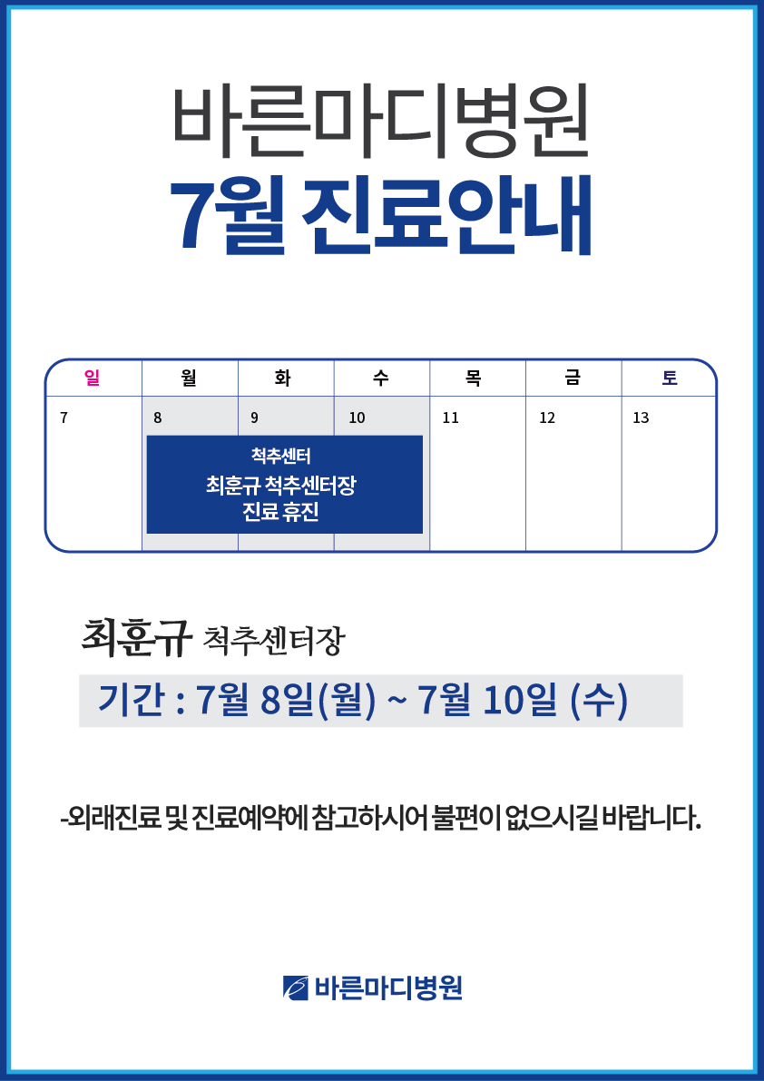본원 최훈규 척추센터장의 학회 참석으로 인해 휴진하게 되어 진료 일정을 공지 드립니다.