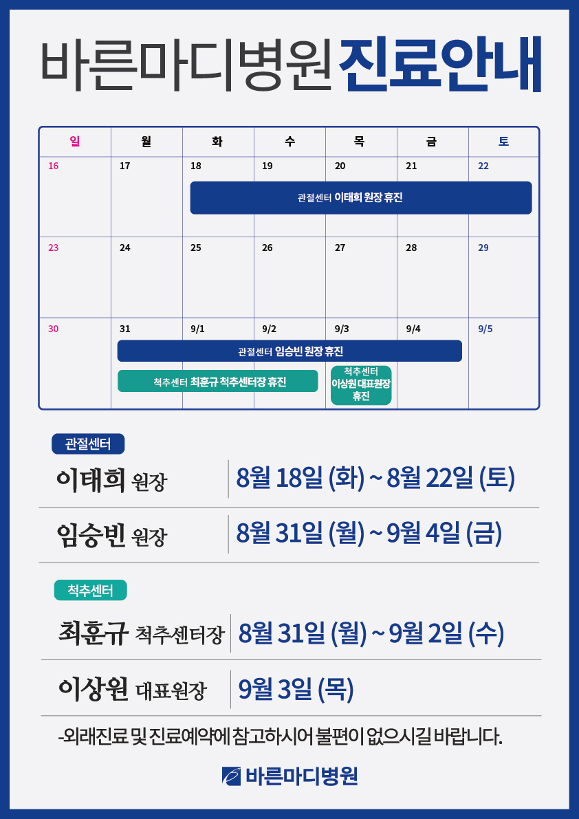 본원 관절센터, 척추센터의 휴진 일정을 공지드립니다.