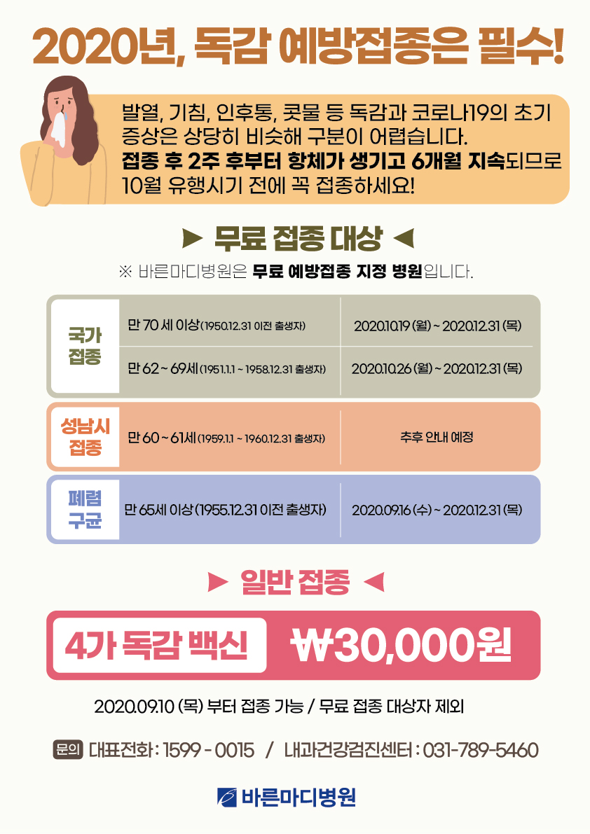 * 저희 바른마디병원은 독감 무료 예방접종이 가능한 지정의료기관입니다.