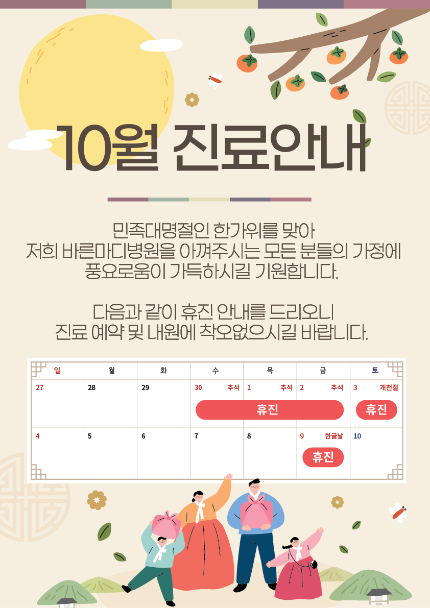10월 3일 개천절을 포함하여 10월 4일까지 휴진합니다.