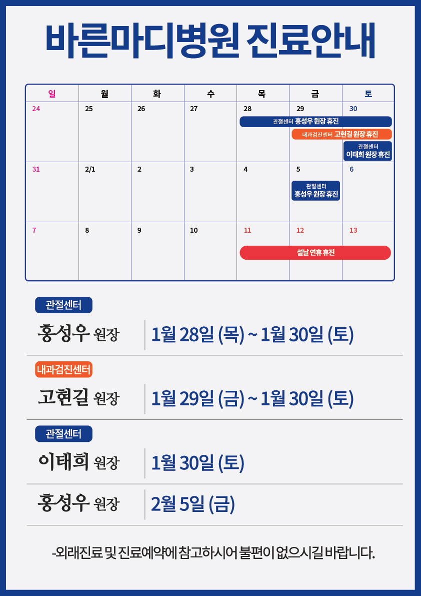 더불어 설 연휴 시작 일인 2월 11일 (목요일)부터 2월 14일 (일요일)까지 휴진합니다.