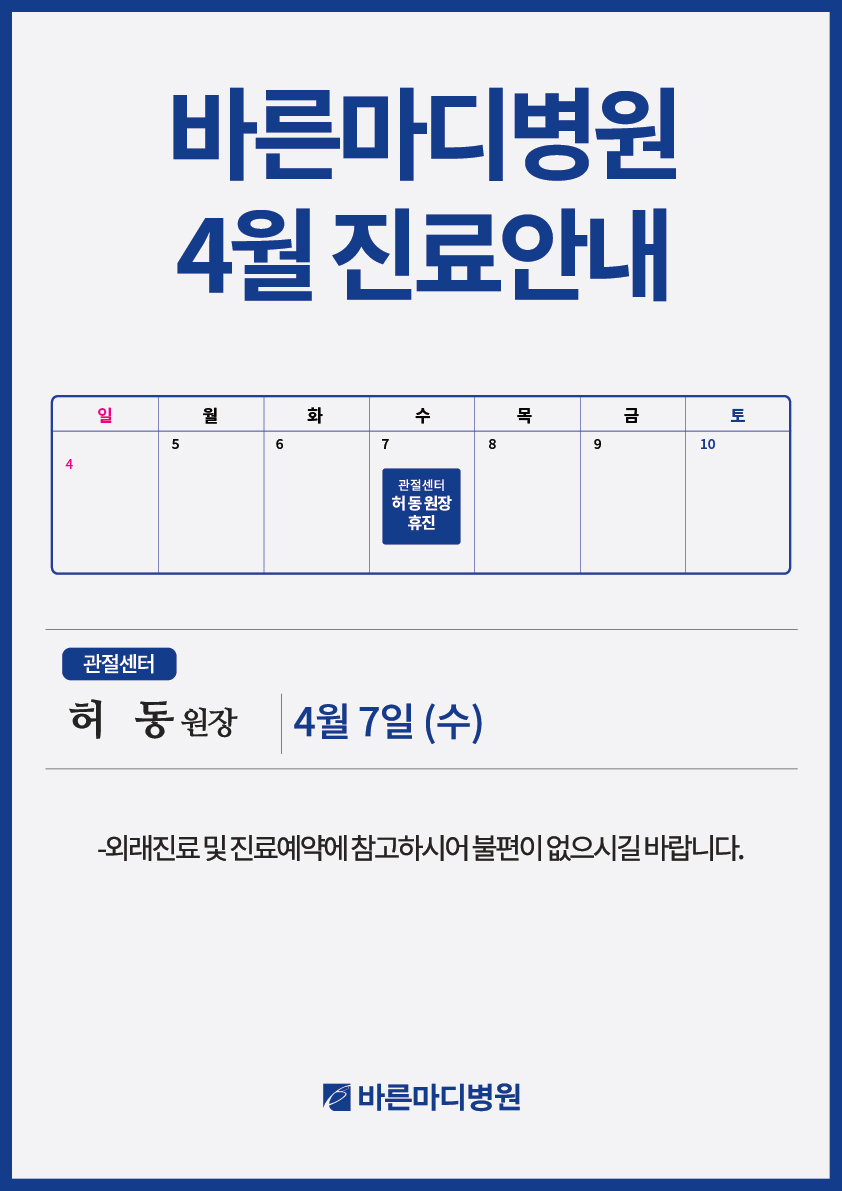 본원 관절센터 허동 원장의 휴진 일정을 공지드립니다.