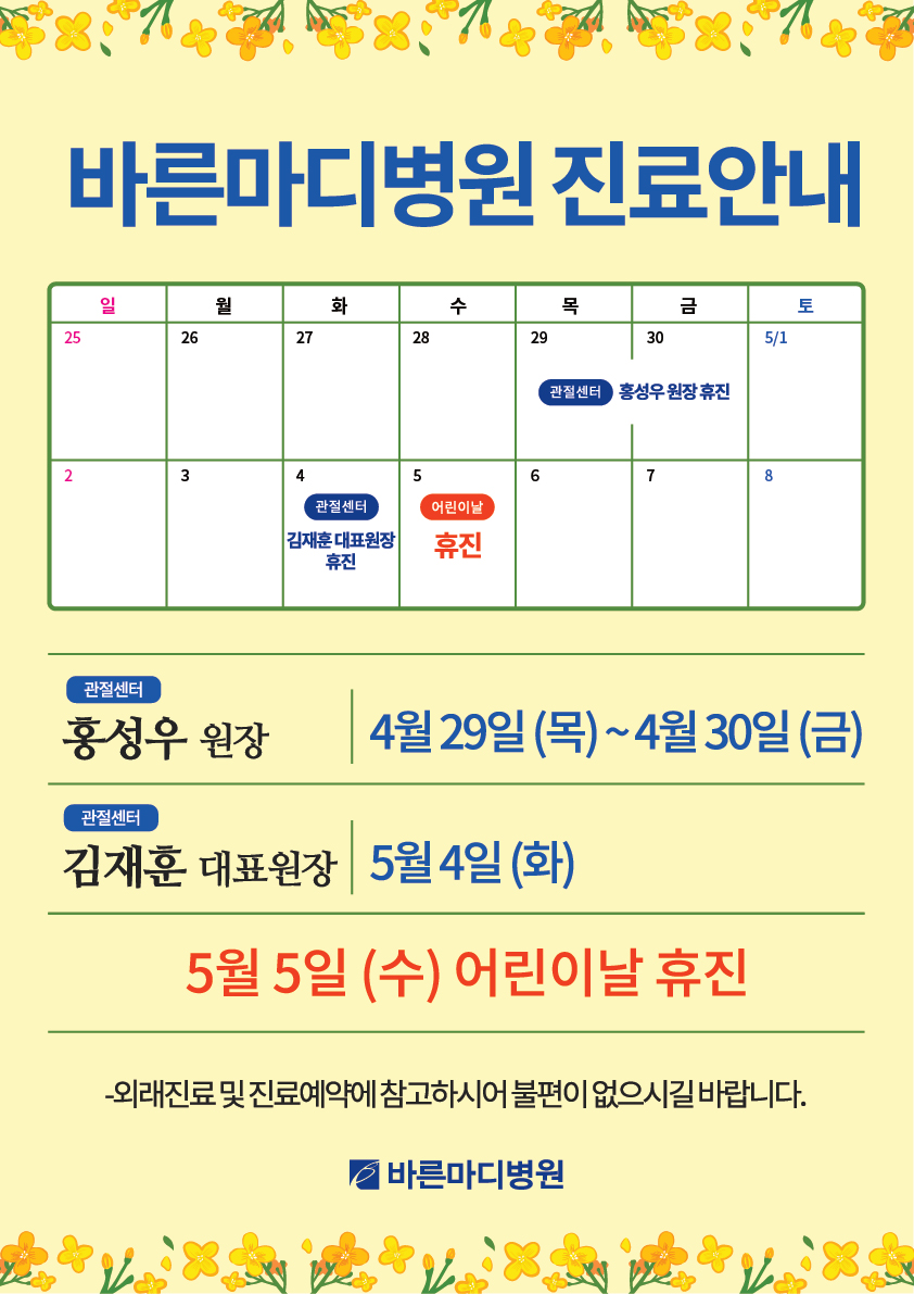 본원 관절센터 김재훈 대표원장과 홍성우 원장의 휴진 일정을 공지드립니다.