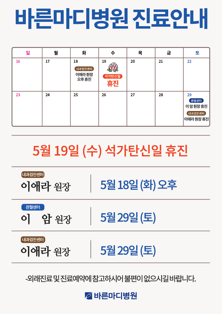 본원 관절센터 이암 원장과 내과검진센터 이애라 원장의 휴진 일정을 공지드립니다.