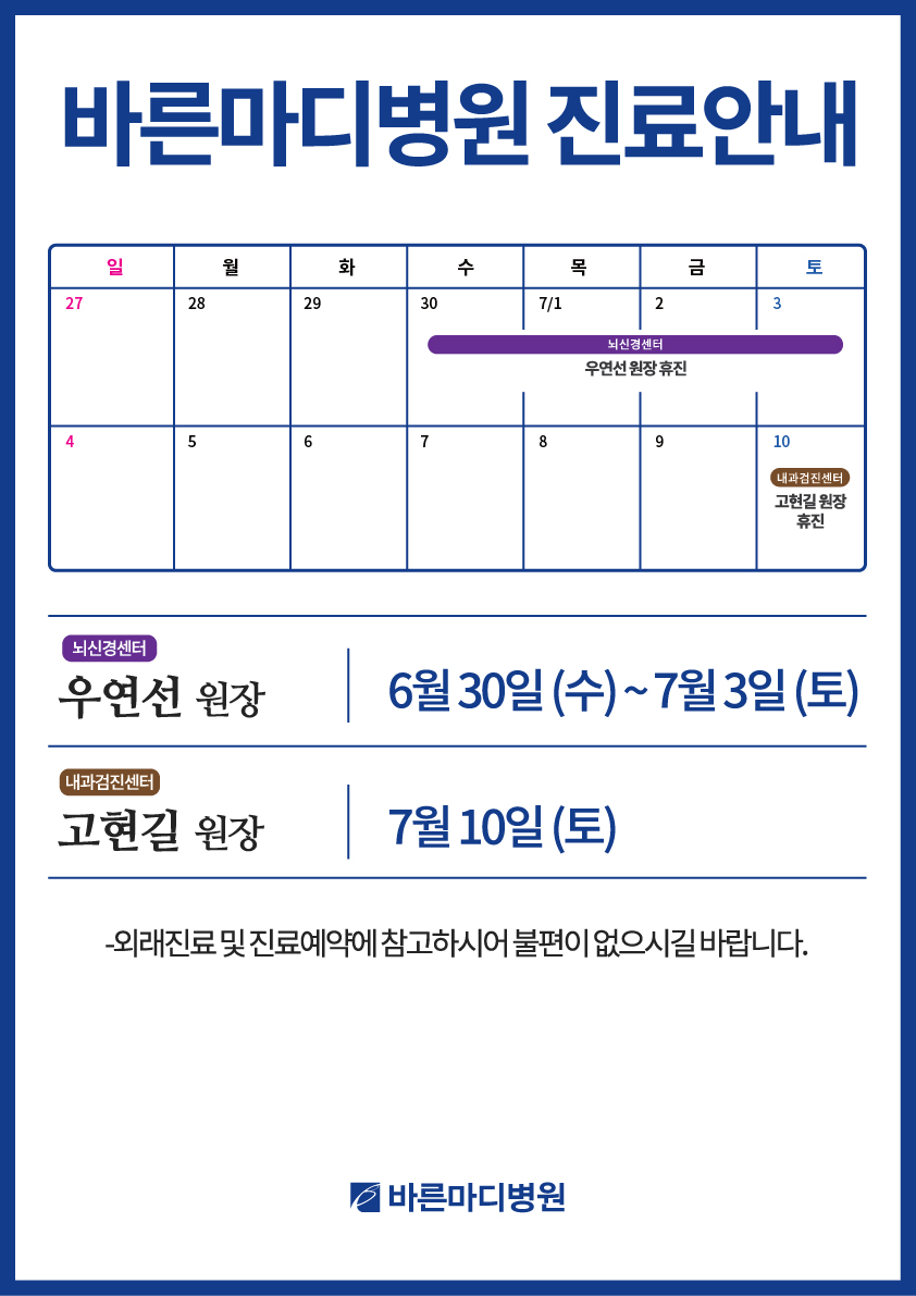 본원 뇌신경센터 우연선 원장과 내과검진센터 고현길 원장의 휴진 일정을 공지드립니다.