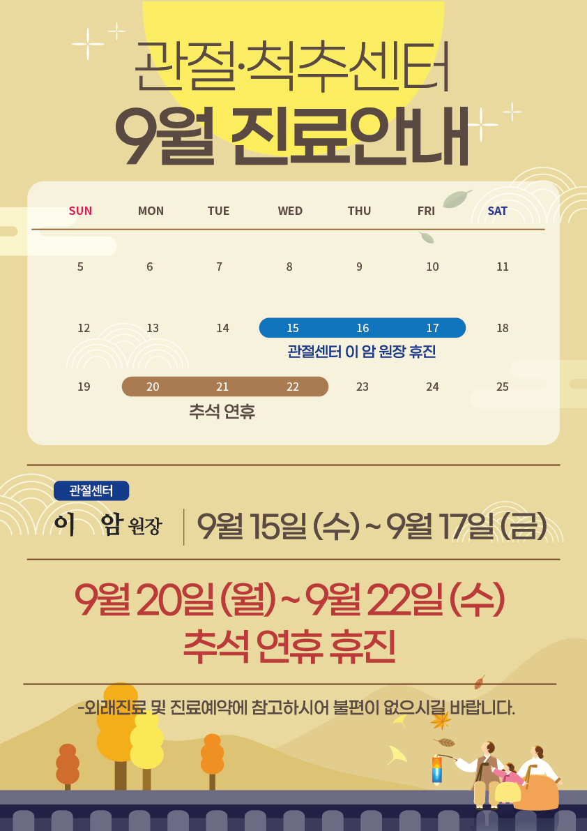 본원 관절센터 이암 원장의 휴진 일정과 올해 추석 연휴를 공지드립니다.