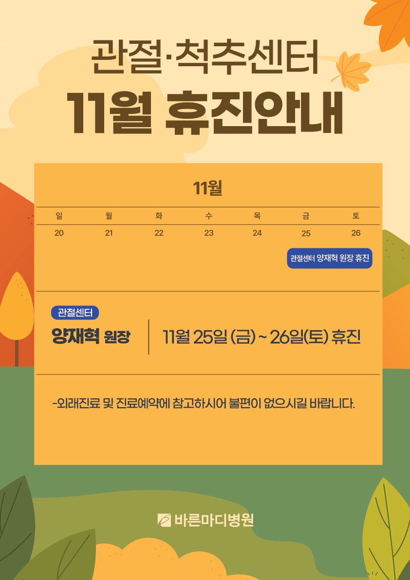 본원 관절센터 양재혁 원장의 휴진 일정을 공지드립니다.