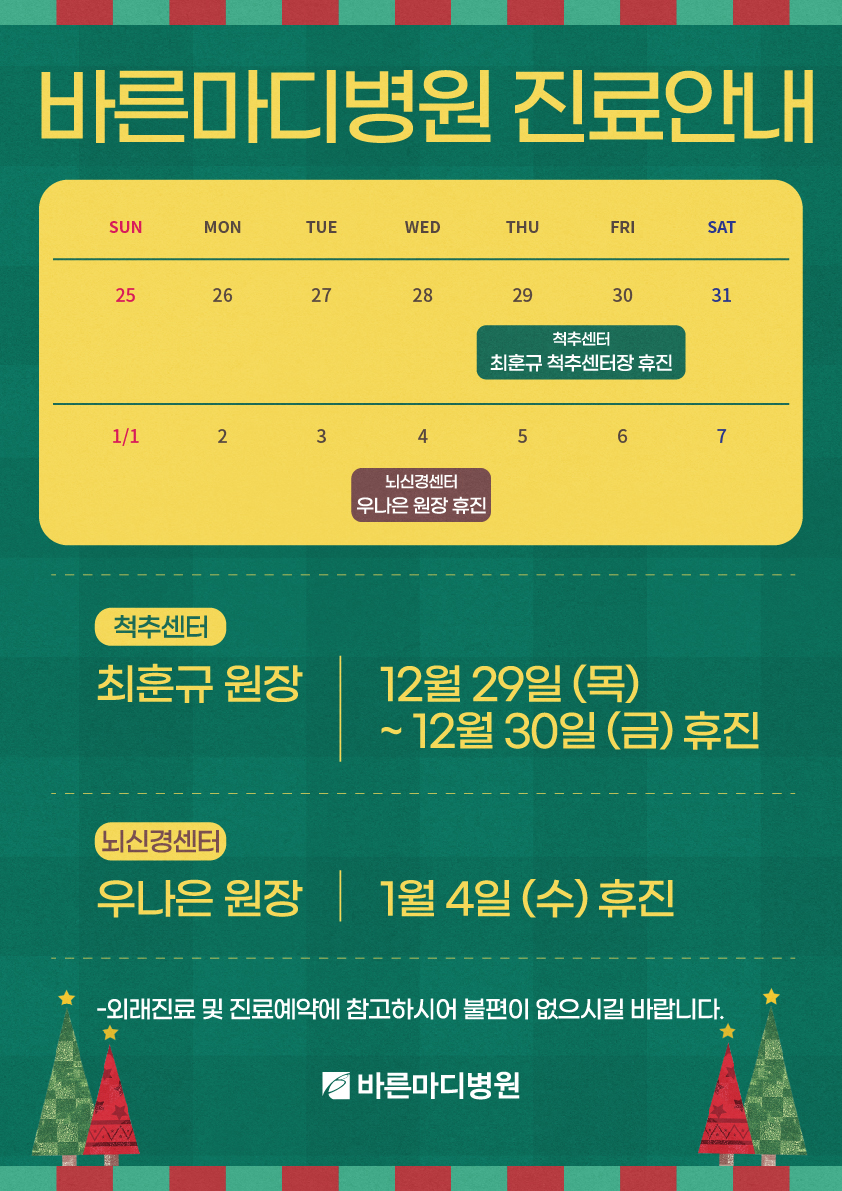 본원 척추센터 최훈규 센터장과 뇌신경센터 우나은 원장의 휴진 일정을 공지드립니다.