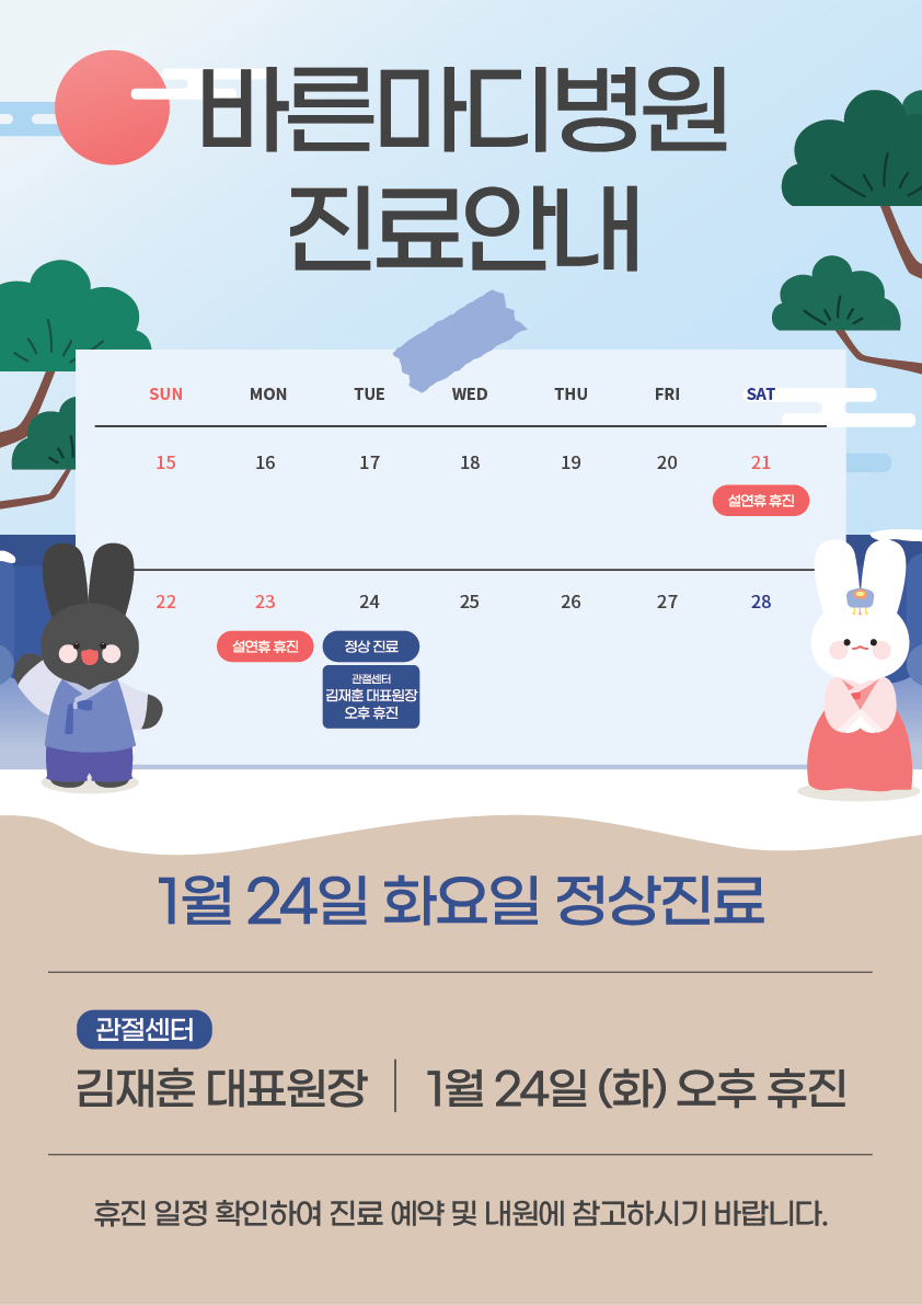 1월 24일(화)은 정상 진료하오니 참고하시어 외래 진료와 예약에 불편 없으시길 바랍니다.