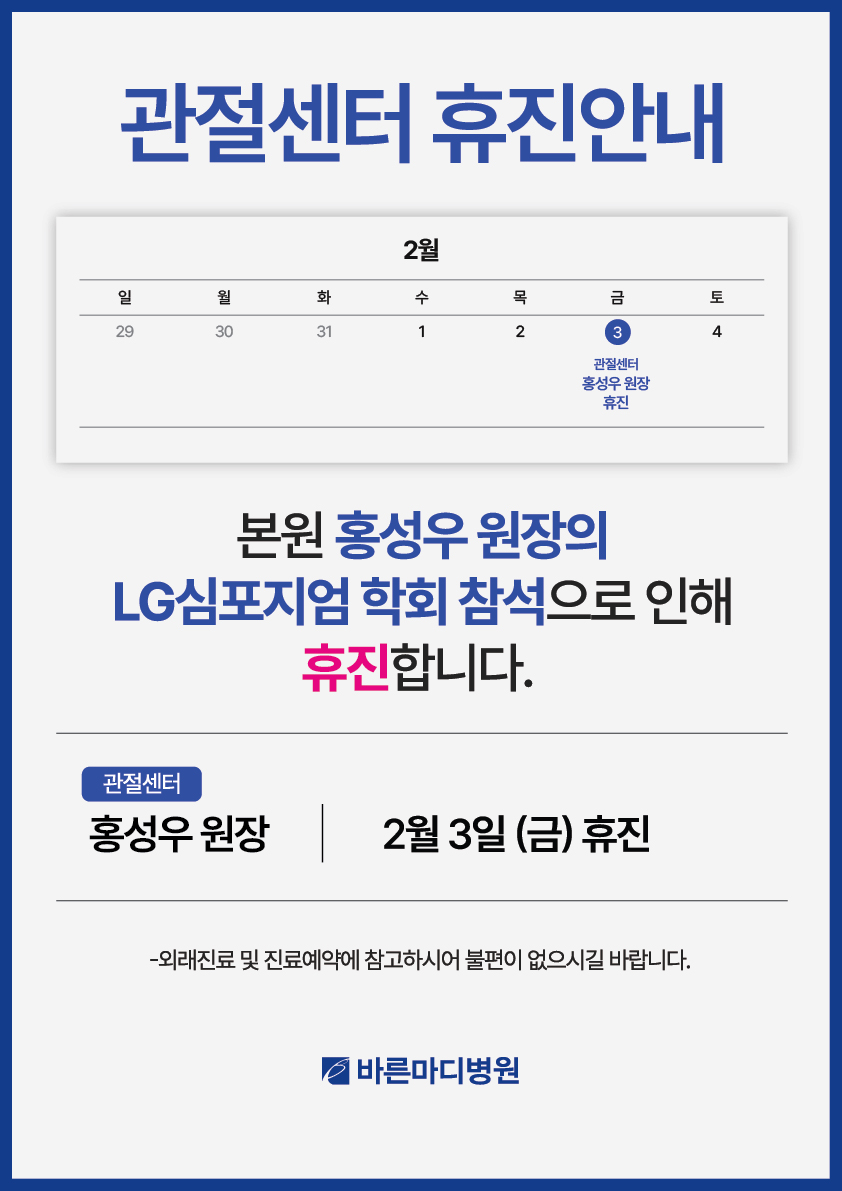 본원 관절센터 홍성우 원장이 학회 참석으로 인해 휴진하게 되어 공지드립니다.