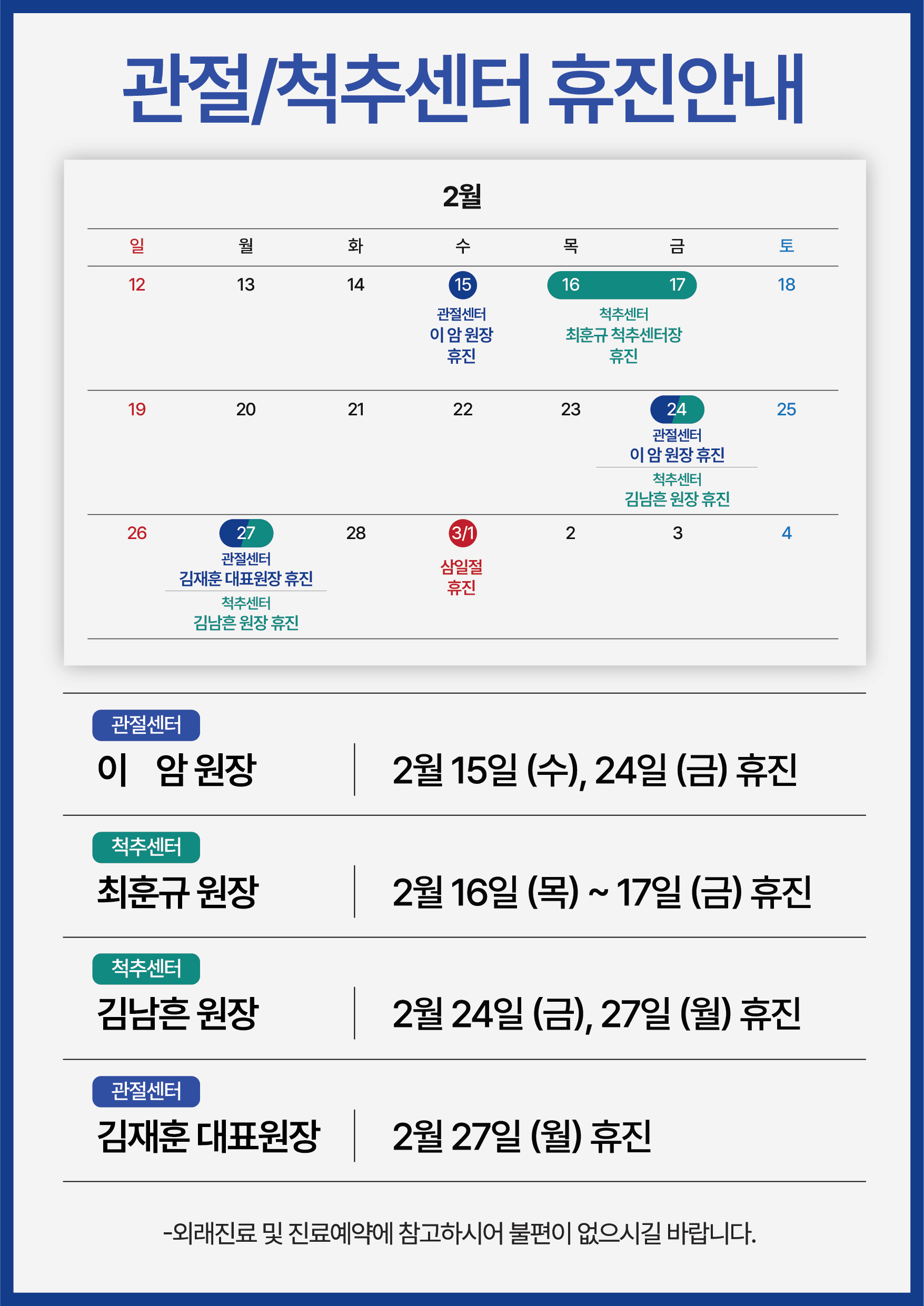 참고하시어 외래 진료와 예약에 불편 없으시길 바랍니다.