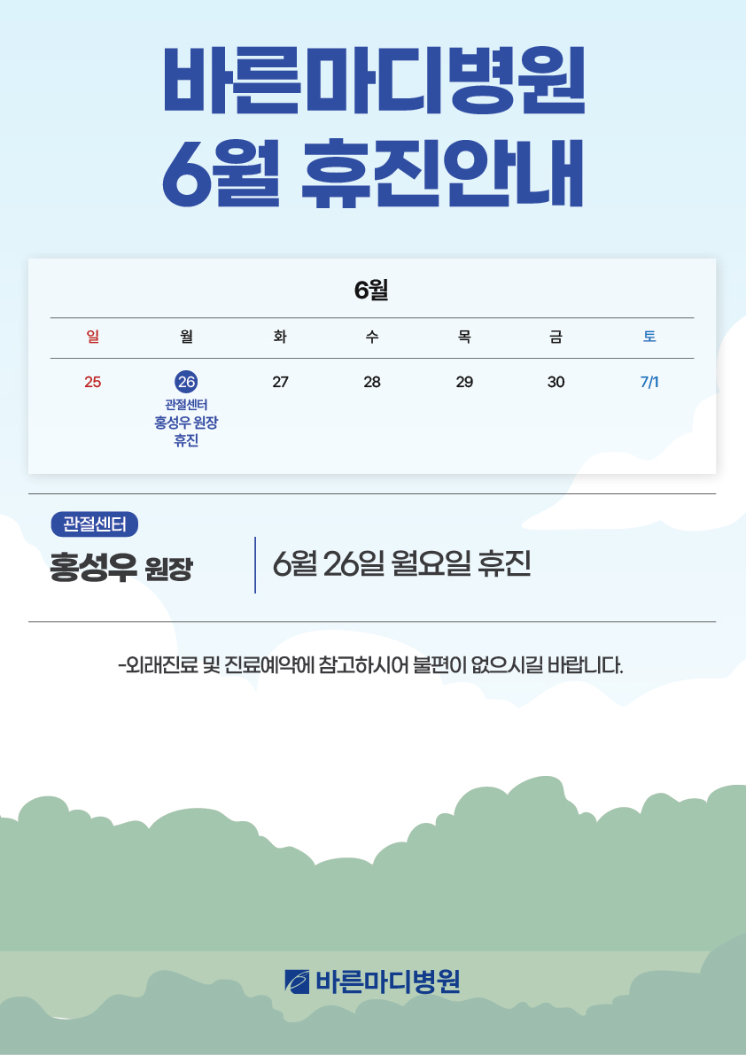 본원 관절센터 홍성우 원장의 휴진 일정을 공지드립니다.