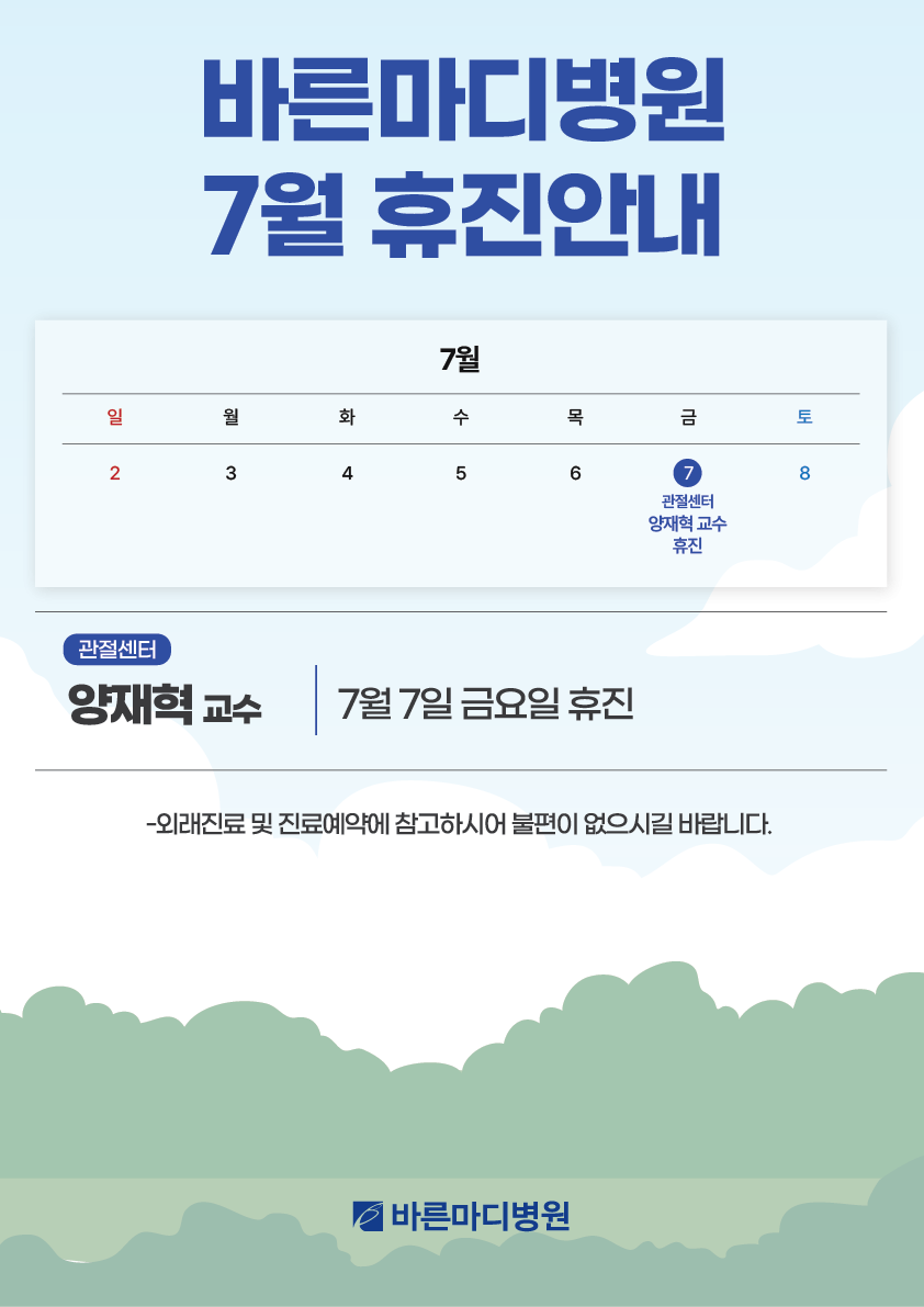 본원 관절센터 양재혁 교수의 휴진 일정을 공지드립니다.