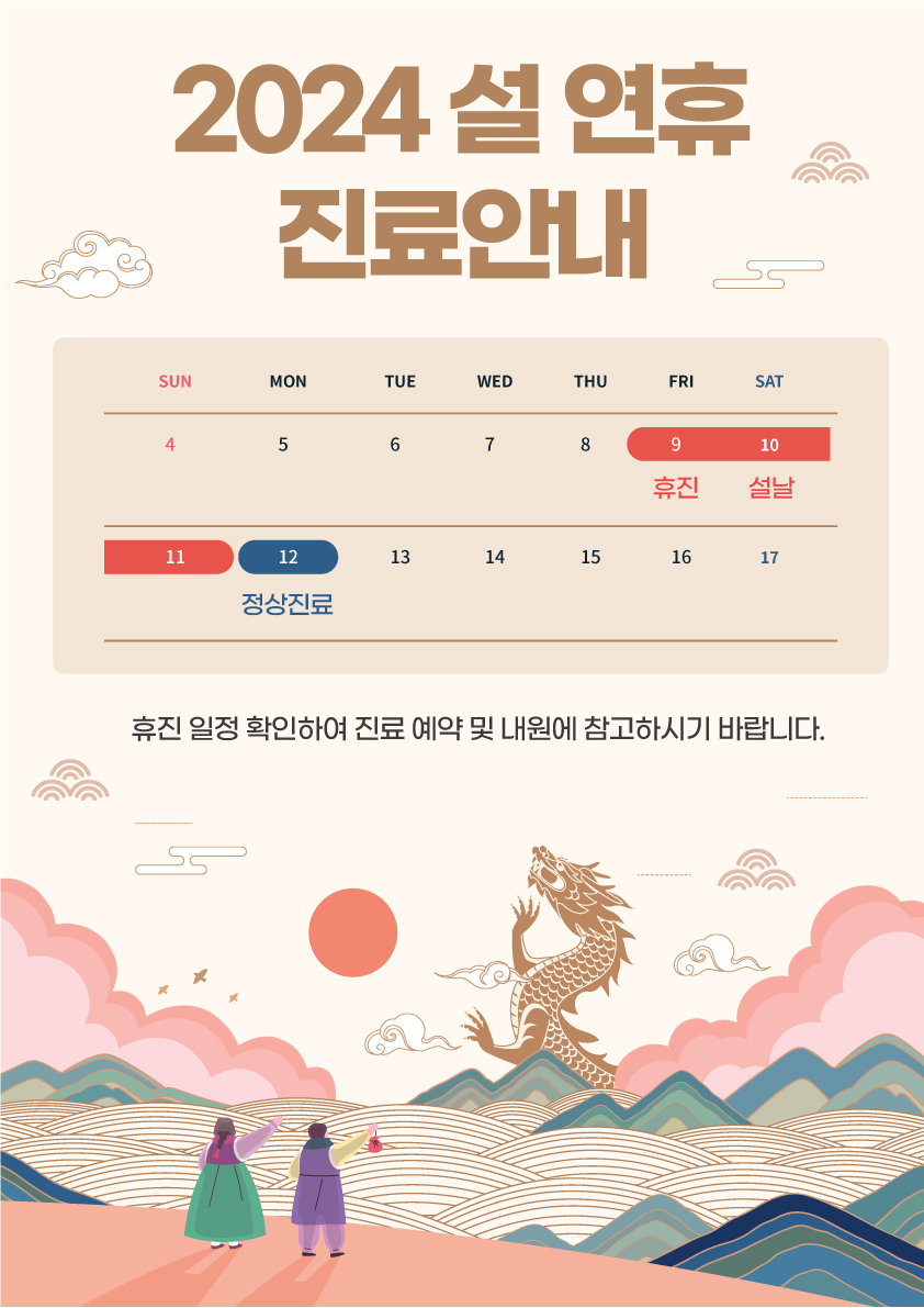 2023년 설 연휴를 맞아 2월 9일(금)부터 2월 11일(일)까지 휴진합니다.