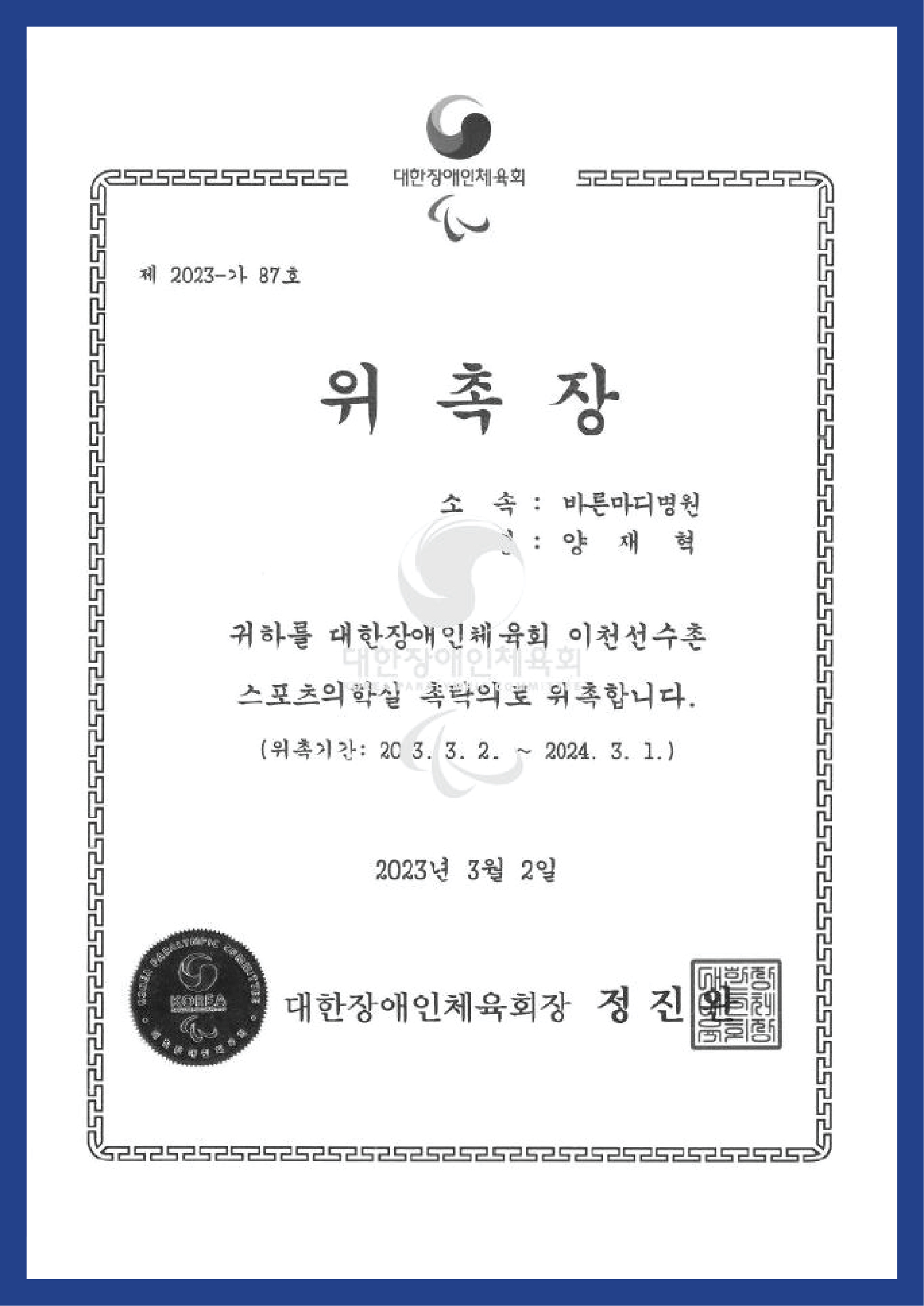 ▼ 대한장애인체육회 이천선수촌 스포츠의학실 촉탁의 ▼