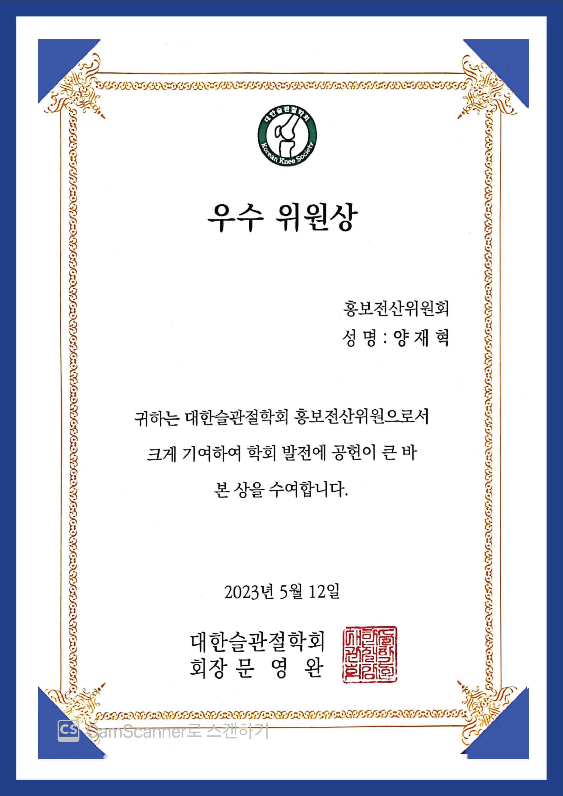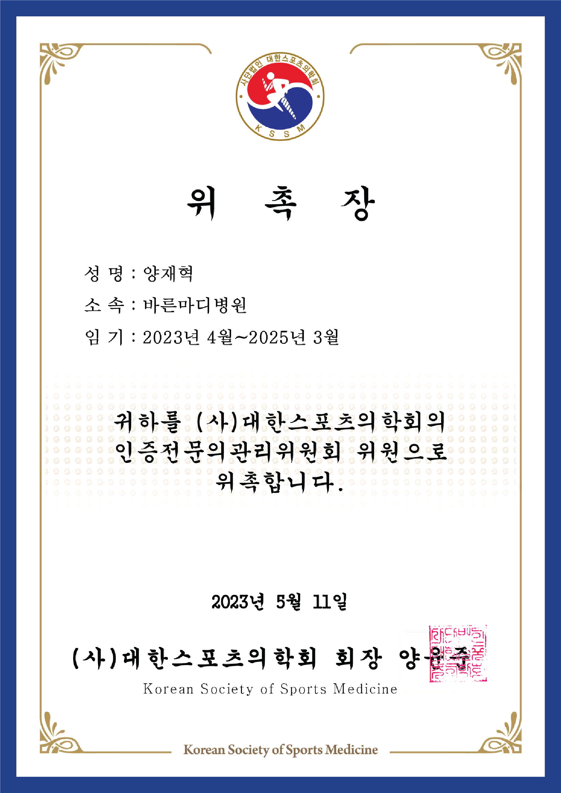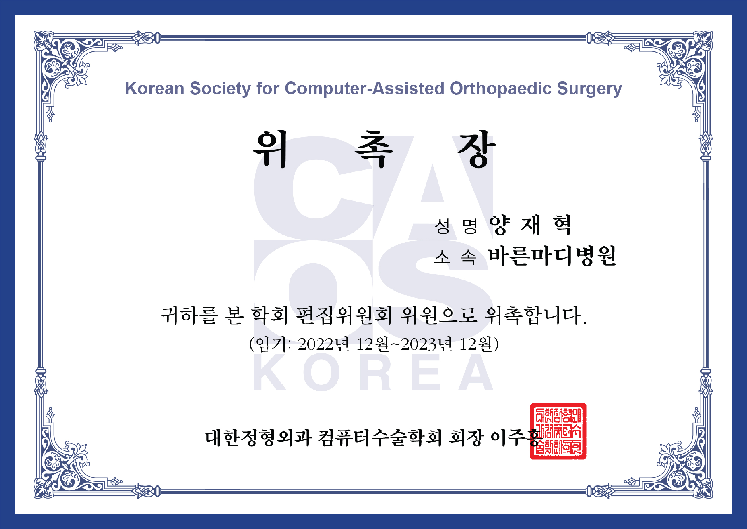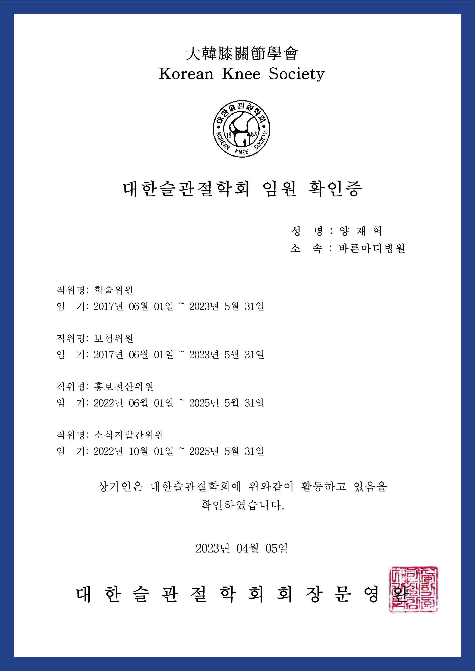 ▼ 대한슬관절학회 임원 확인증 ▼