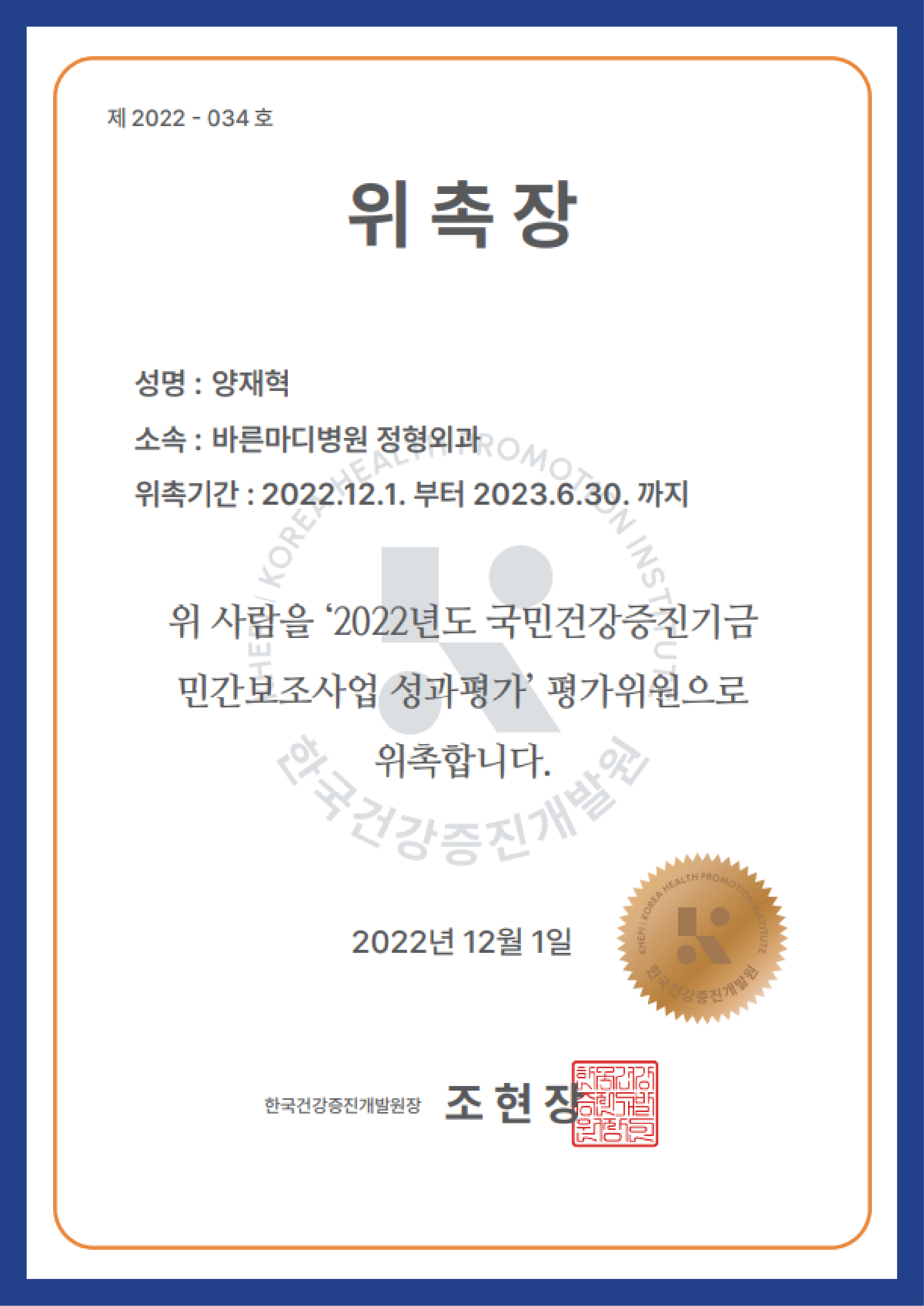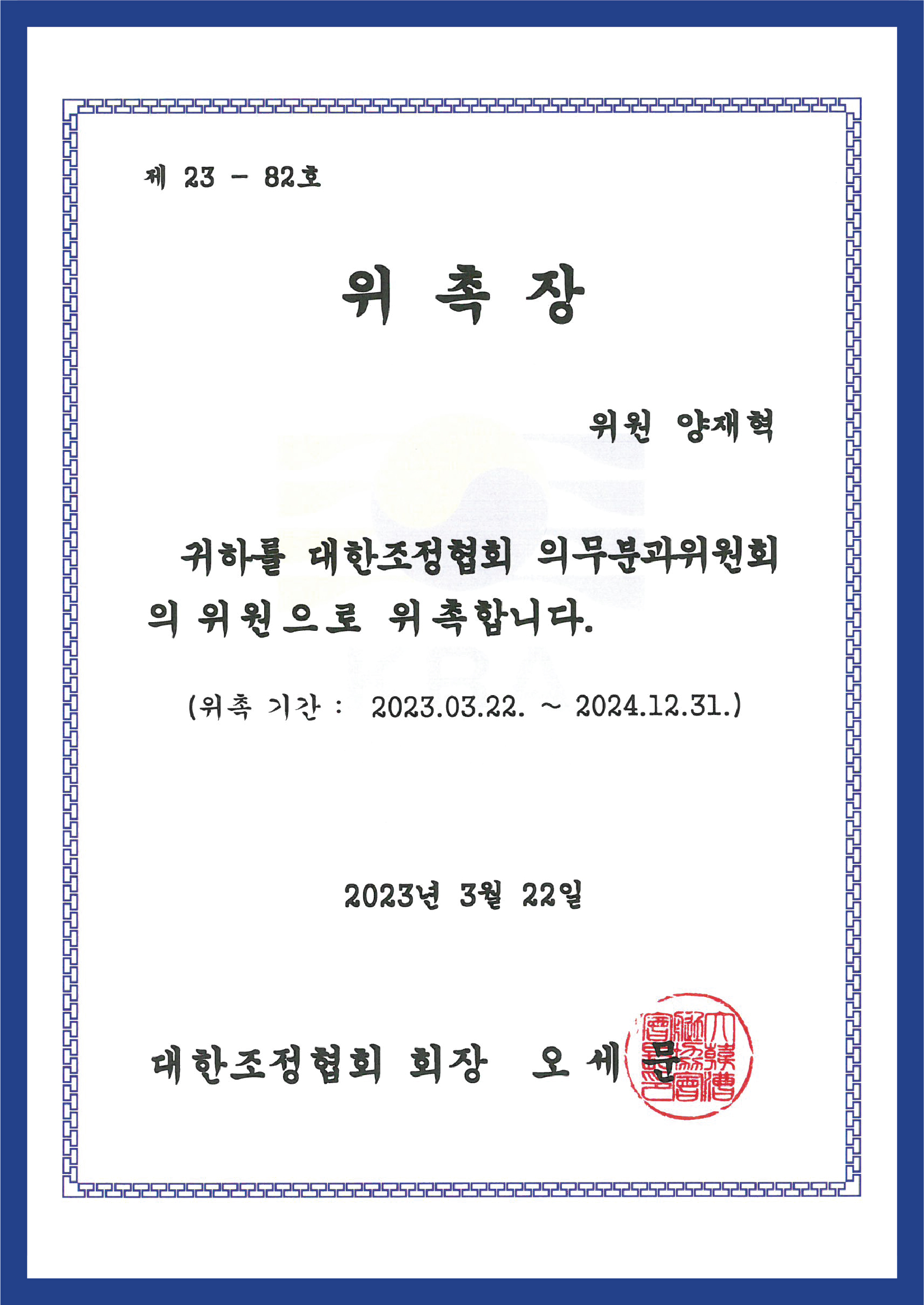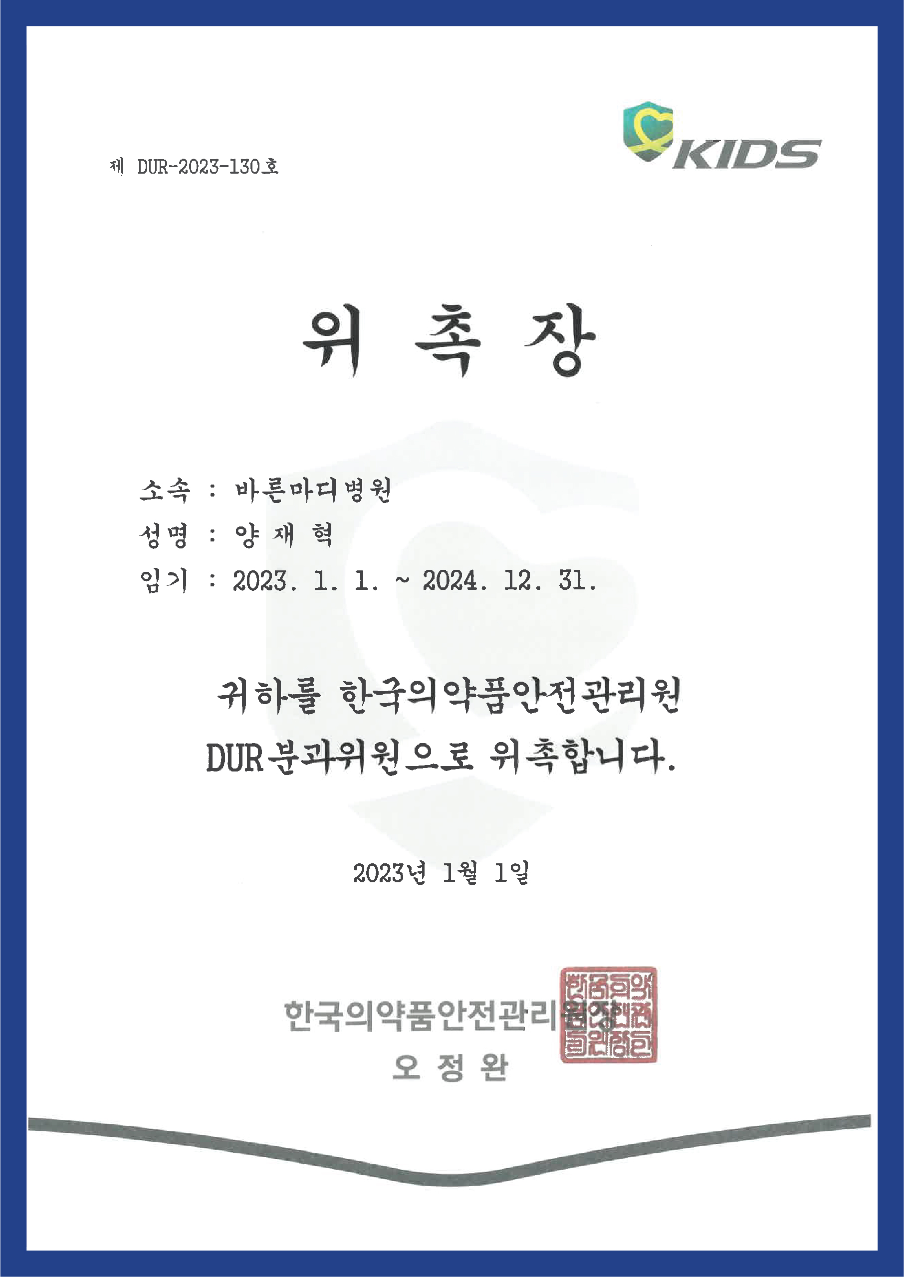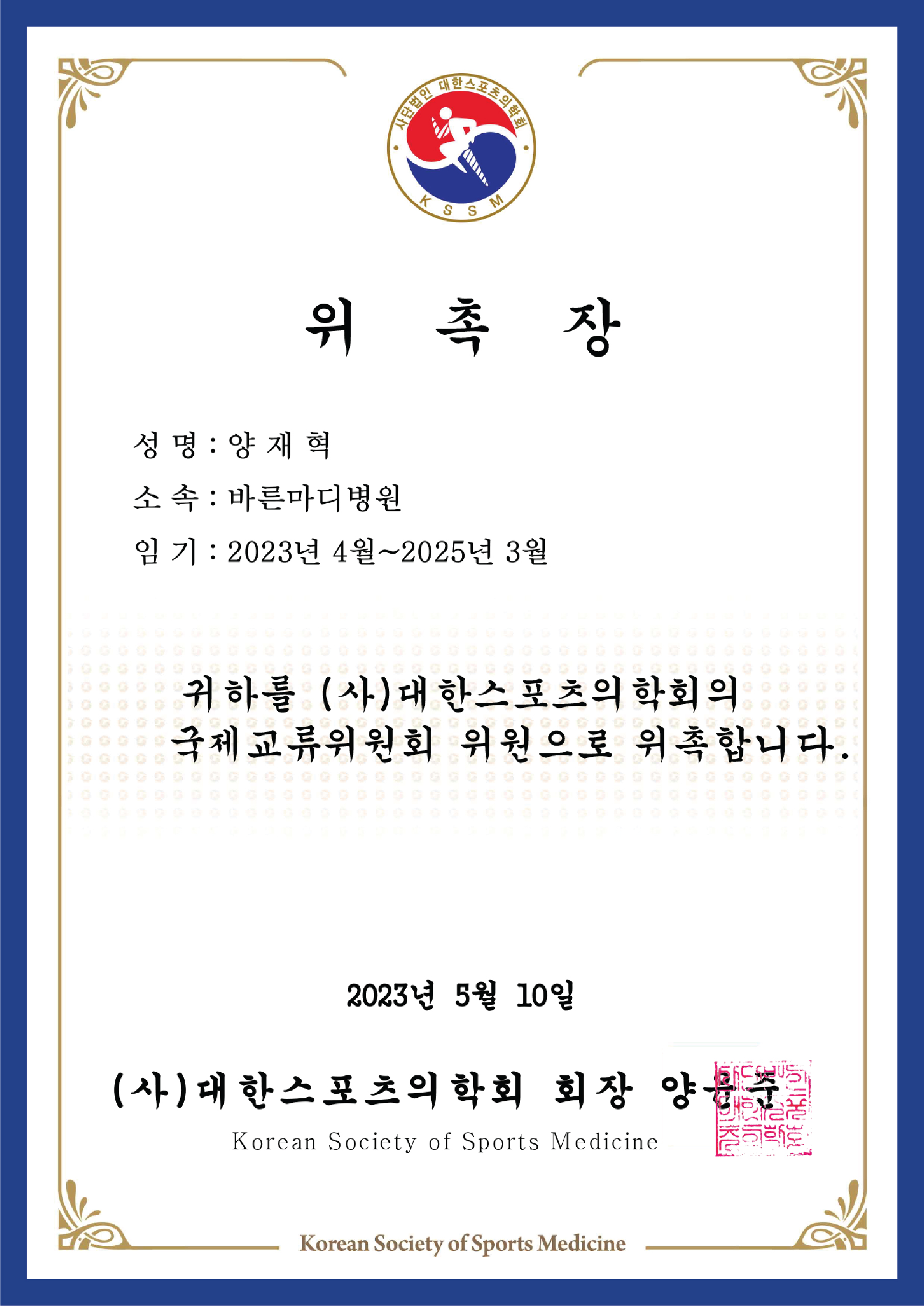 ▼ 대한슬관절학회 임원 확인증 ▼